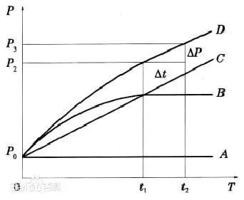 开始压强上升较快,而后渐渐减慢,最后变成斜率为ΔP/Δt的直线。这说明容器即有放气也有漏气。曲线D可以认为是B和C的叠加。如果出现曲线C和D的情况,则判定系统有漏气。